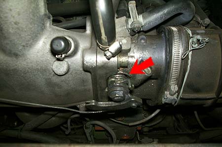 結局はハウジングを全部バラして、市販のコイルスプリングを加工し組み込んだとの由。何かあるとイケナイからと、ハウジング内部の本来のスプリングの他にスロットルカムからエンジン下部にかけてもう一系統?リターンスプリングが引っ掛けてあるという念入りよう。(下の赤矢印)