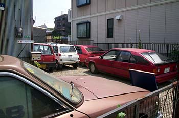 ▲いつもセワになっている修理屋のヤード。中央奥の赤いのがウチのGTi。