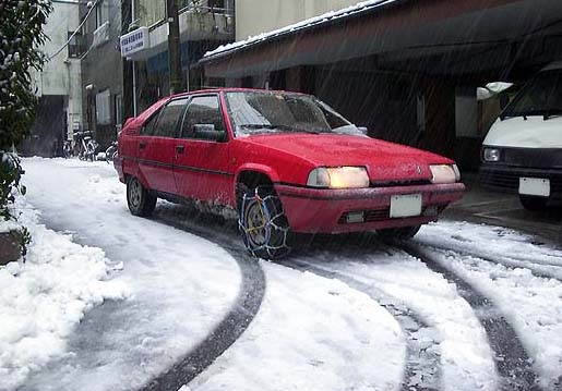 雪が降る降る自宅前にて。この冬はスタッドレスに履き替えそびれていたので、久々にチェーンを巻いた。 2001.1