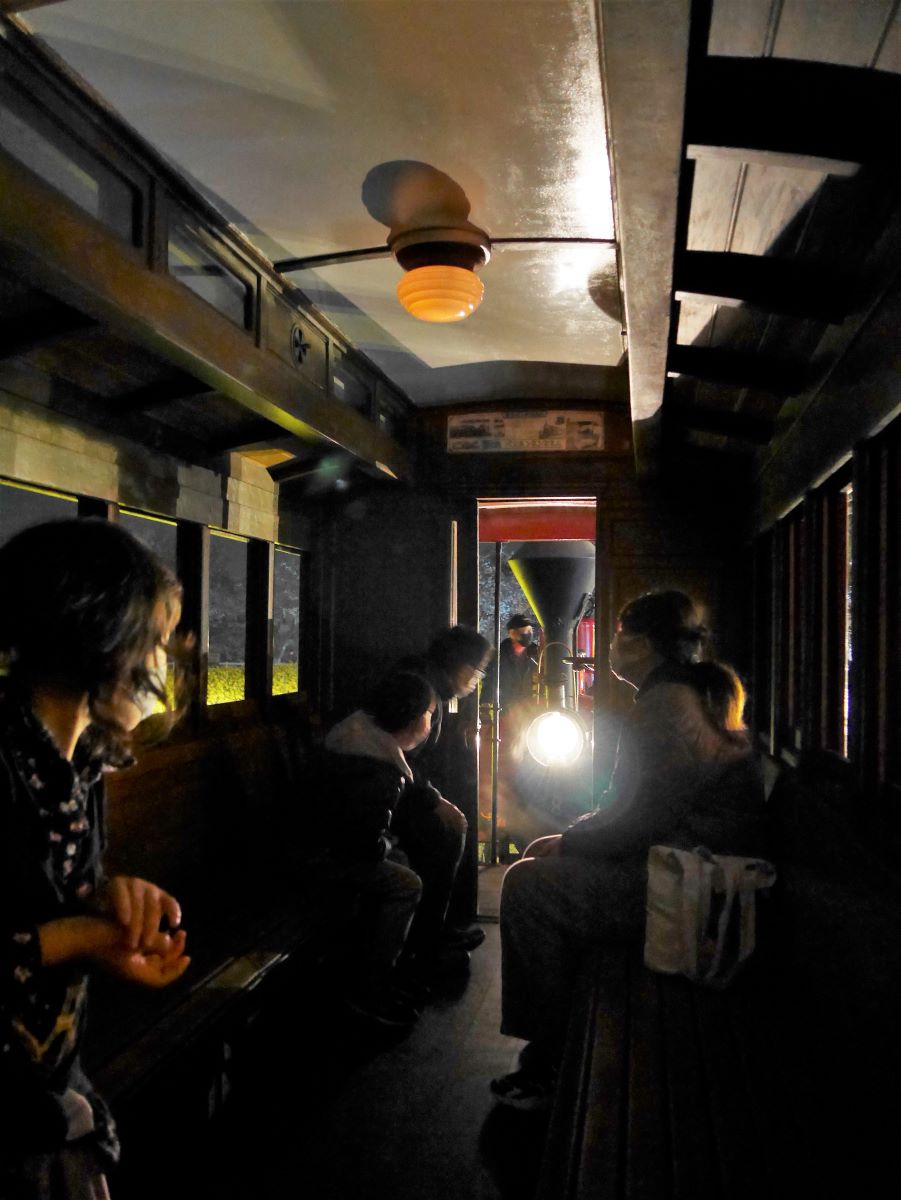 2枚目は、日没後の列車にて客車の電灯がバッテリー切れ寸前となり、ヘッドライトを室内灯代わりにすべく急遽8号機を後補機に付けたときの様子。もともと客車に室内灯が付いていなかった木曽の森林鉄道で、トンネル通過や夕刻以降の運転時には機関車の後側のヘッドライトを点灯して客車内を照らしていたことに倣った粋な計らいである。