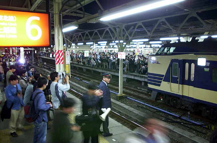 583が上京してくるってんで、魔がさして見物に行ってみたら…先日のお召しなんかよりよっぽどスゴイんじゃないスかねぇ?というくらいの砲列、そして笛と怒号の渦。折しも6番線からE231の中電が発車寸前、メガホン持った駅員氏も気が気じゃなさそう。いやマッタク、どなた様もご苦労様であります<(_ _)ゞ。 『想いでの583系はつかり号』@上野駅 2001.4.28/Kodak DC3800