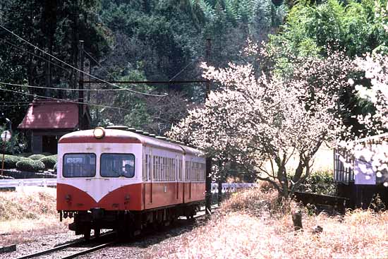 ▲私がはじめて大井川鉄道を訪れたのは、もう15年以上前の、ちょうど梅の咲き誇る季節のことだった。 蒸機列車や井川線と並んで、バラエティ豊かな電車たちもこの鉄道の大きな魅力だが、 さすがに世代交代は進んでおり、初訪問当時と変わることなく運用に就いているのは、いまでは写真の 元西武351系のグループ2連2本のみである。しかし、つい先日そのうち1本が脱線事故を起こしてしまったという。 人的被害がなかったのは幸いなれど、古い車輛だけに今後の去就が心配でならない。 大井川鉄道 田野口付近(?) クハ512or513+モハ312or313 1986.3.16 SPF 135mm KR |