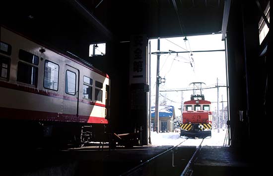 十和田市でひととおり撮影ののち、七百の車庫に足を向けてみると、側線には除雪仕業を終えてきたばかりのED301が、そして庫の中にはすっかり出番の減ってしまったモハ3401が静かに佇んでいた。40年以上もこの鉄道の歴史をみつめてきた2輛だが、モハの方は昨秋のステンレスカー置き換えで名実ともに鬼籍入り(※)してしまっている。凸電のほうは元気でいるだろうか。