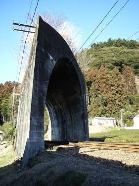 それはともかくこのトンネルもどき、ごらんのように断面が線路に対して斜めになっているのが大きな特徴である。今はなき索道が線路に対して斜めに横切っていたことを雄弁に物語ると同時に、見る角度によってガラリと表情が変わるあたりがなんとも面白い。