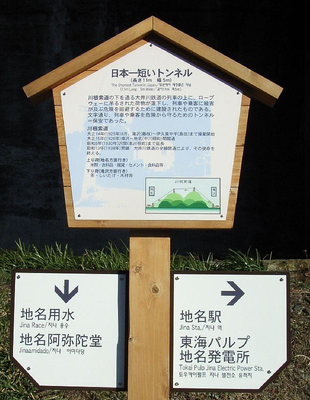 いかにもトマソンなこの構造物は、むかしこの上を通っていた『川根電力索道』の落下物防止用シェッドというのが本来の役割だった。現物の脇には、最近立てられたとおぼしき“日本一短いトンネル”と謳われた説明板が立てられているのだが、厳密にはトンネルというべきかどうか微妙な代物。そもそも、仮にトンネルであるとしても、公称11mということは実際に鉄道用で一番短い吾妻線の樽沢隧道(7.2m)よりは長いのだから、説明板の記述には少々首をひねらざるを得ない。