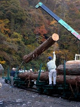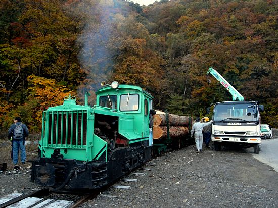 酒井5t(No.132)に連ねた3組の運材台車に、地元の木材業者から借用した立派なヒノキの原木18本を積み込んでのフォトラン。昼間の紅葉まっ盛りの中をゆく走行シーンも素晴らしかったが、林鉄好きの身には、実際に運材台車へ原木を積み込む一部始終をつぶさに観察することができたのが何より得難い体験であった。実現に携わった方々に、あらためて感謝。