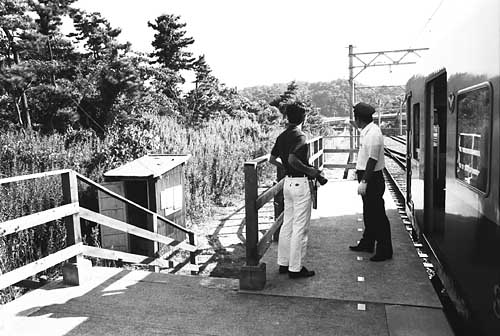 ▲車掌氏は「向こうには養翠園があって…」なんて話でもしているのか。ちなみに左側の小屋は便所。/写真すべて1987.9,1