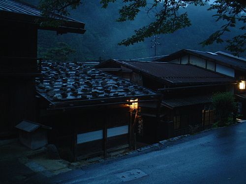 ▲夕闇に包まれる妻籠宿。右側の『松代屋』に投宿した。