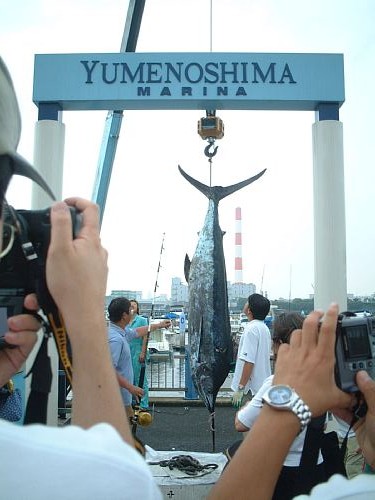 ▲左:被爆船として有名な第五福竜丸のエンジン。新潟鉄工製だそうなり。/▲右:マリーナで偶然カジキの水揚げに遭遇。126kgだって、スゴイねえ〜。