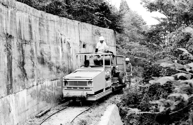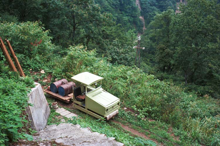 塗色もさることながら、当初はGL無番号機と同様、種車のスタウトのグリルを流用していたことがわかる。 無番号機のそれと異なるのは、元のヘッドライトのケーシングにフタがされずポッカリと穴が開いたままになっていることで、パッと見、古い4輪軽トラックがそのまま線路を走っているかのような感じだ。 ▲起点に近くの本線上にて ▼小口川第三発電所付近(画面左上が合宿所) |