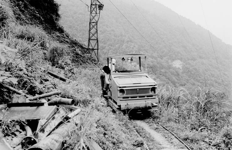 また、1976年に匿名希望A氏が訪問した際には、この軌道の機関車は橙色の無番号GLしか存在しなかったことが確認されていることから、これでGL2号機の登場時期は、この写真の撮影された'78年もしくは前年の'77年のどちらかに絞り込めるようになった。じっさい、写真を見た限りでは塗装の状態も良く、お目見えしてからあまり時間が経っていないであろうことが伺える。 場所は、小口川第三発電所合宿所玄関辺りからの俯瞰。 |