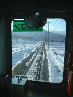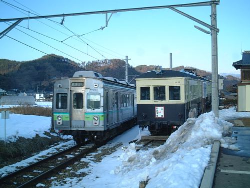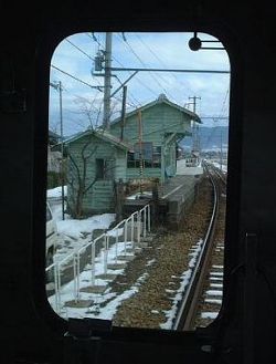 車内からの眺め。雪景色の沿線と、八木沢駅。