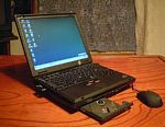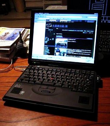 CPU=Mobile Pentium III 700MHz/ メモリ=128MB→384MB/ HDD=20GB→40GB/ OS=Windows98SE→Windows2000SP3→SP4 (自宅ではウルトラベースX2併用) 2002.8導入 初めて導入された積年の夢(?)・自家用ThinkPad。