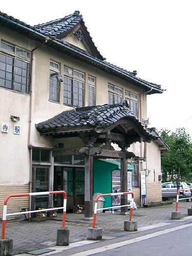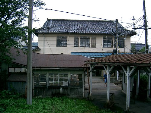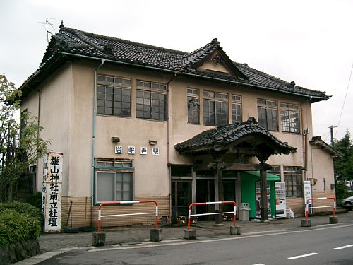 駅舎はモルタル2階建ながら、社殿風の瓦屋根を頂く一種異様な外観だが