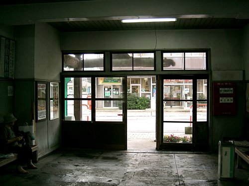 待合室の内部から駅前を臨む