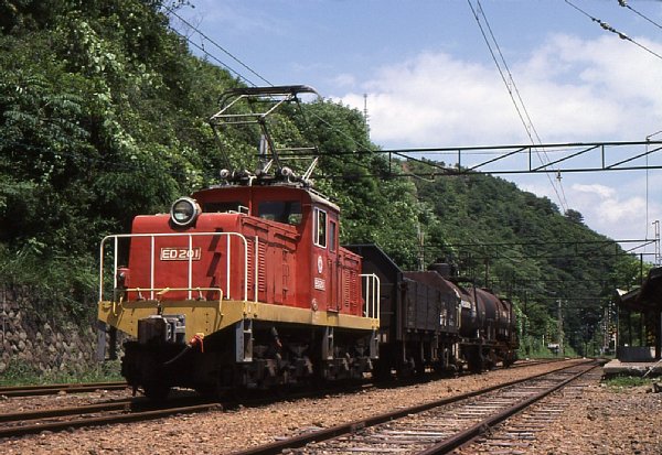 ▲細倉駅で小休止するED201の貨物列車 従えるはトラ45000+硫酸タキ2輛 1986.7.24 SPF 55mm KR |