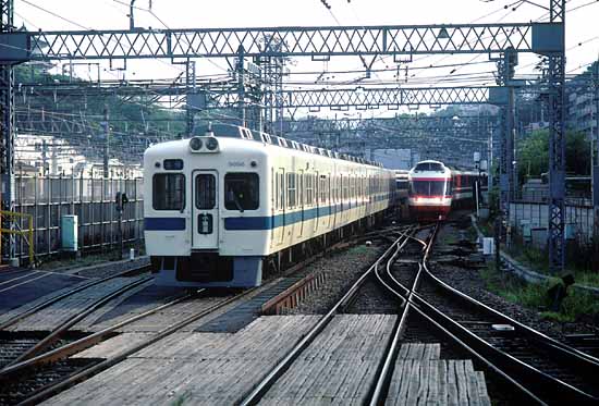 ▲引き上げ線に向かう5000系と新宿行きHi-SEの離合 小田原 2002.4.14 M6 90mm PKR