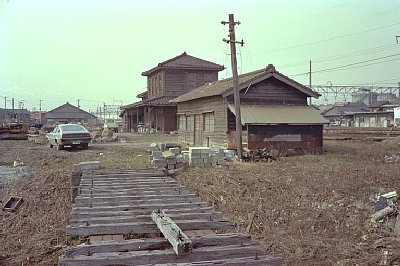 ▲かつての同線の要衝であった百間町駅の跡。駅舎はすでにないものの、旧本社々屋(左)と旧機関庫(右)が姿を留めていた。